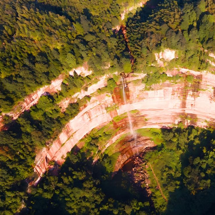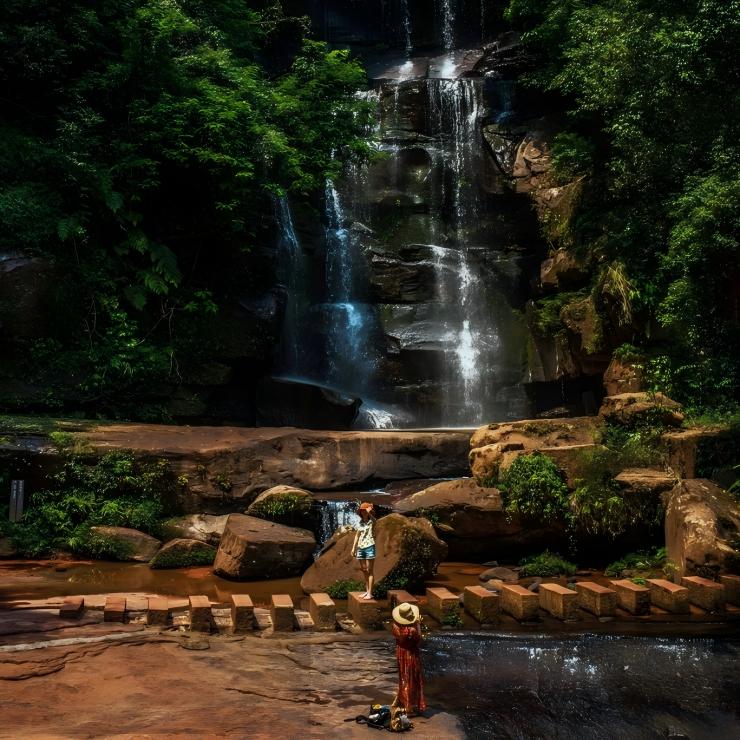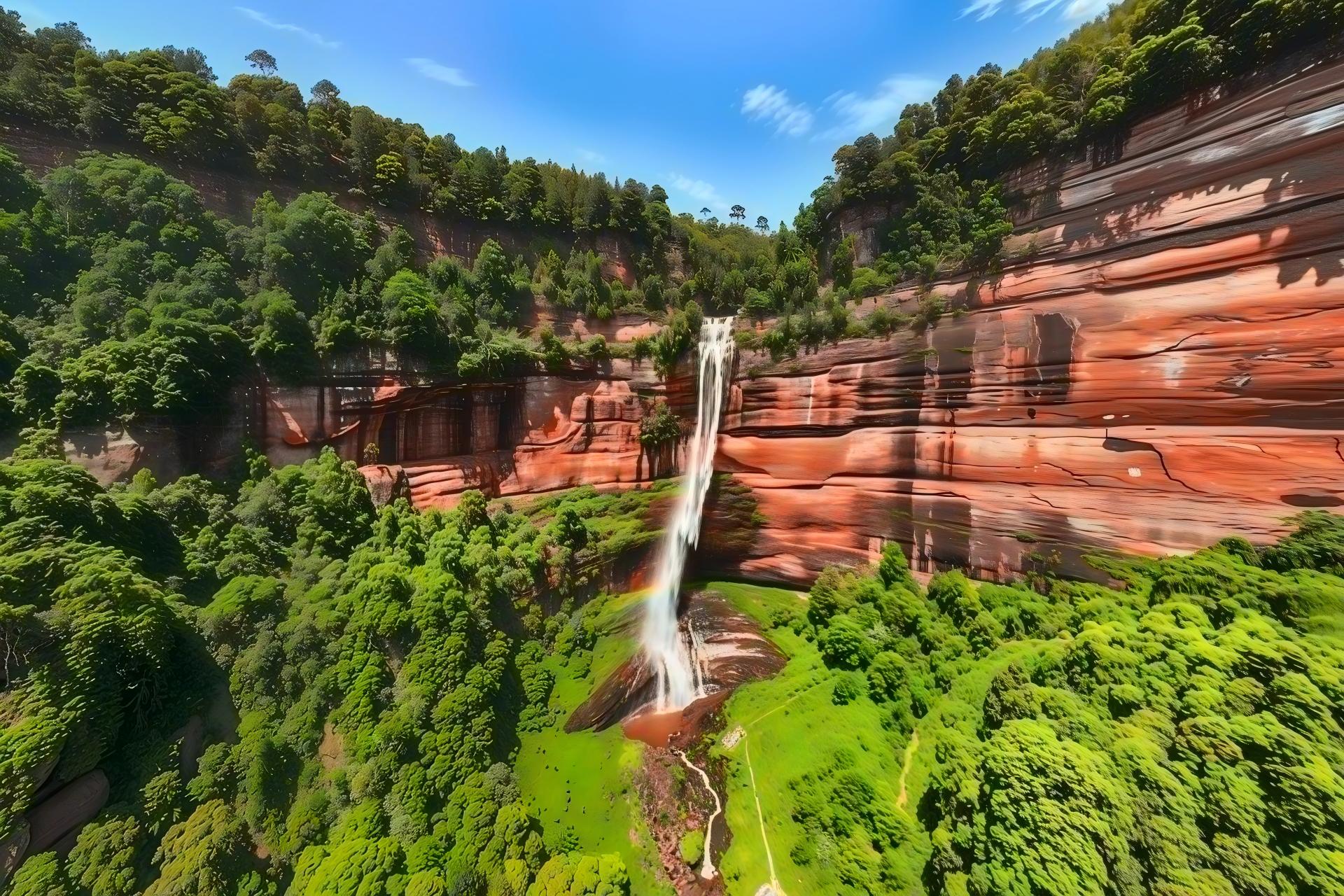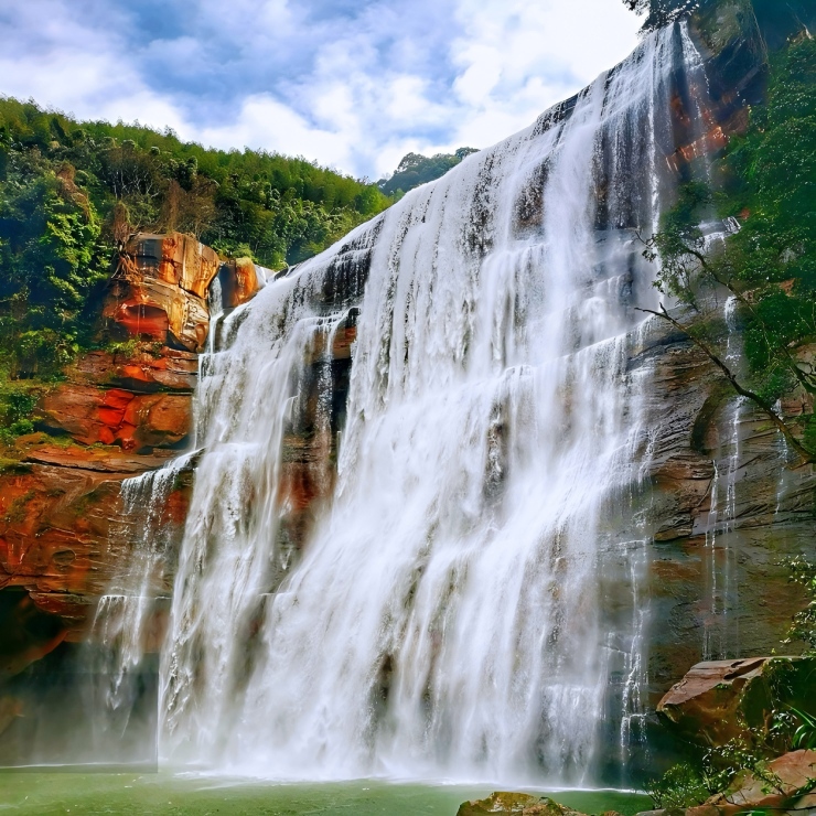 "บนยอดเขาของหน้าผาสีแดงเข้ม ให้ชมน้ำตกที่ไหลลงมาเหมือนริบบิ้นสีเงินสู่สระน้ำลึก หมอกที่หมุนวนทำให้ทัศนียภาพเลือนลาง ไม่แน่ใจว่าฝนหรือหมอก—เหลือไว้เพียงความรู้สึกเย็นสบายและตื่นตะลึงอย่างลึกซึ้ง"