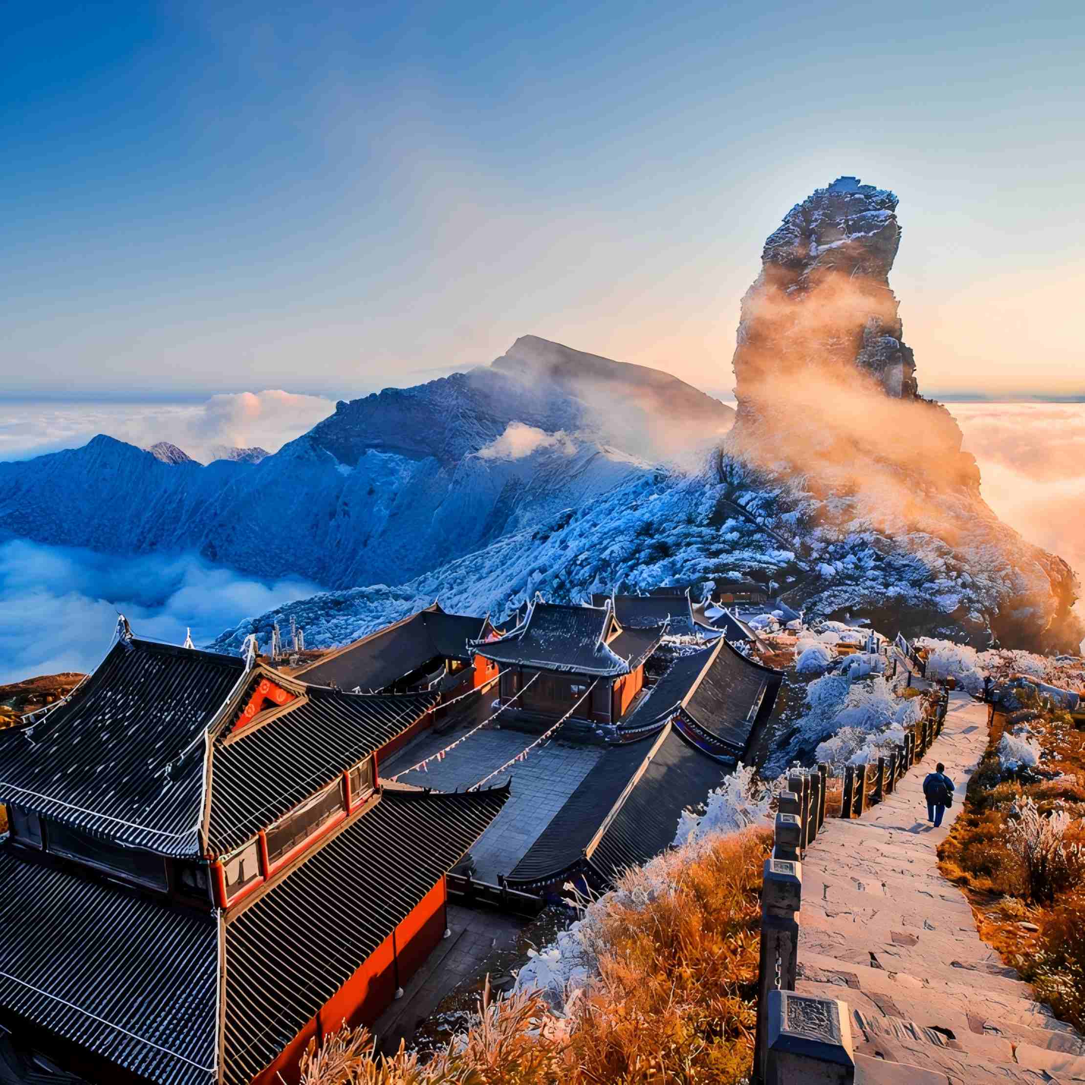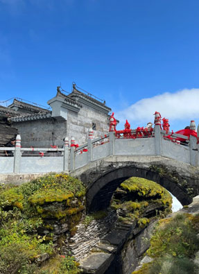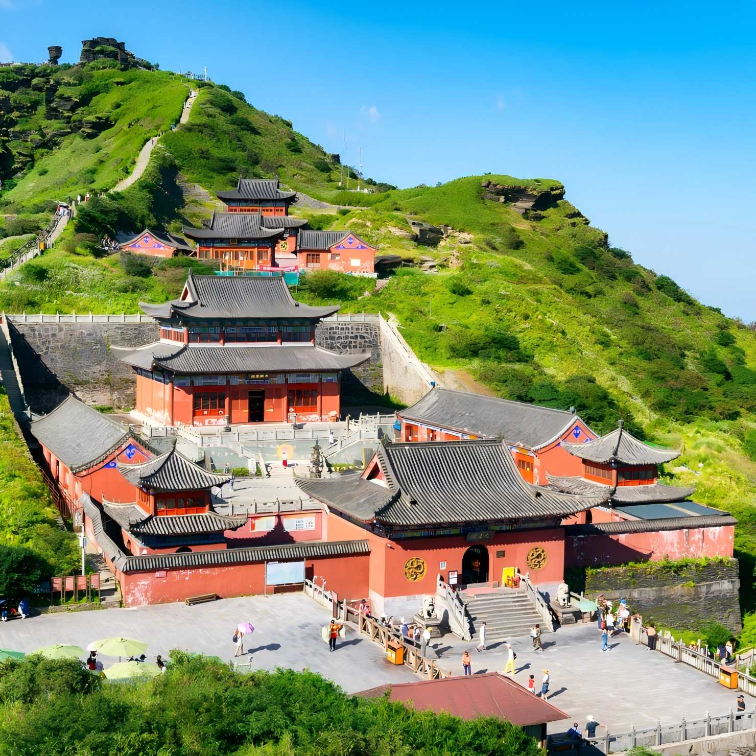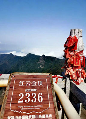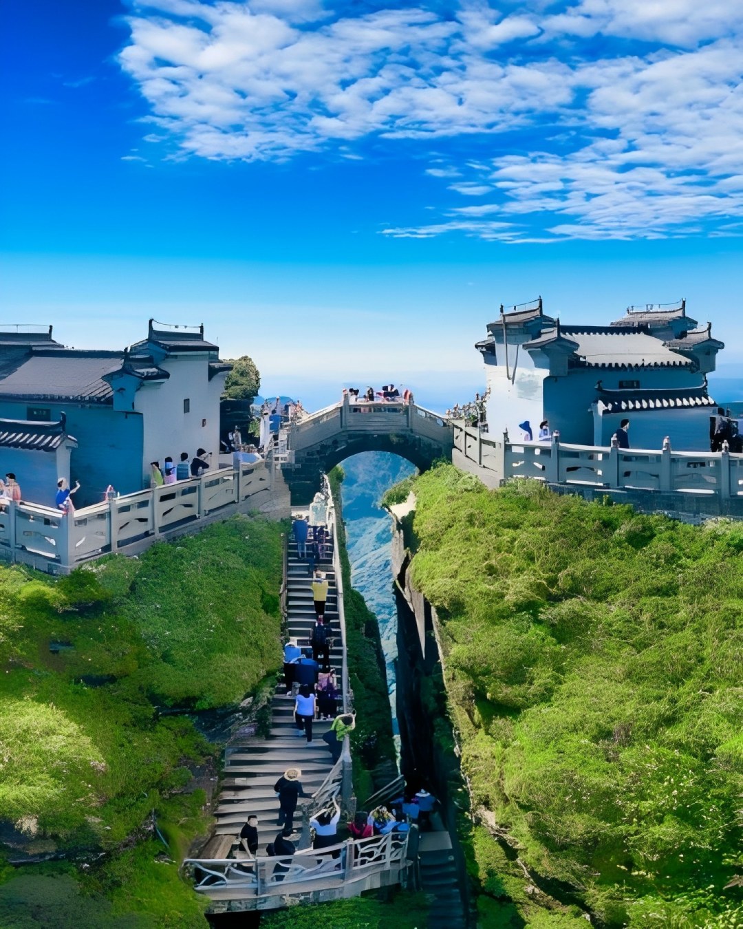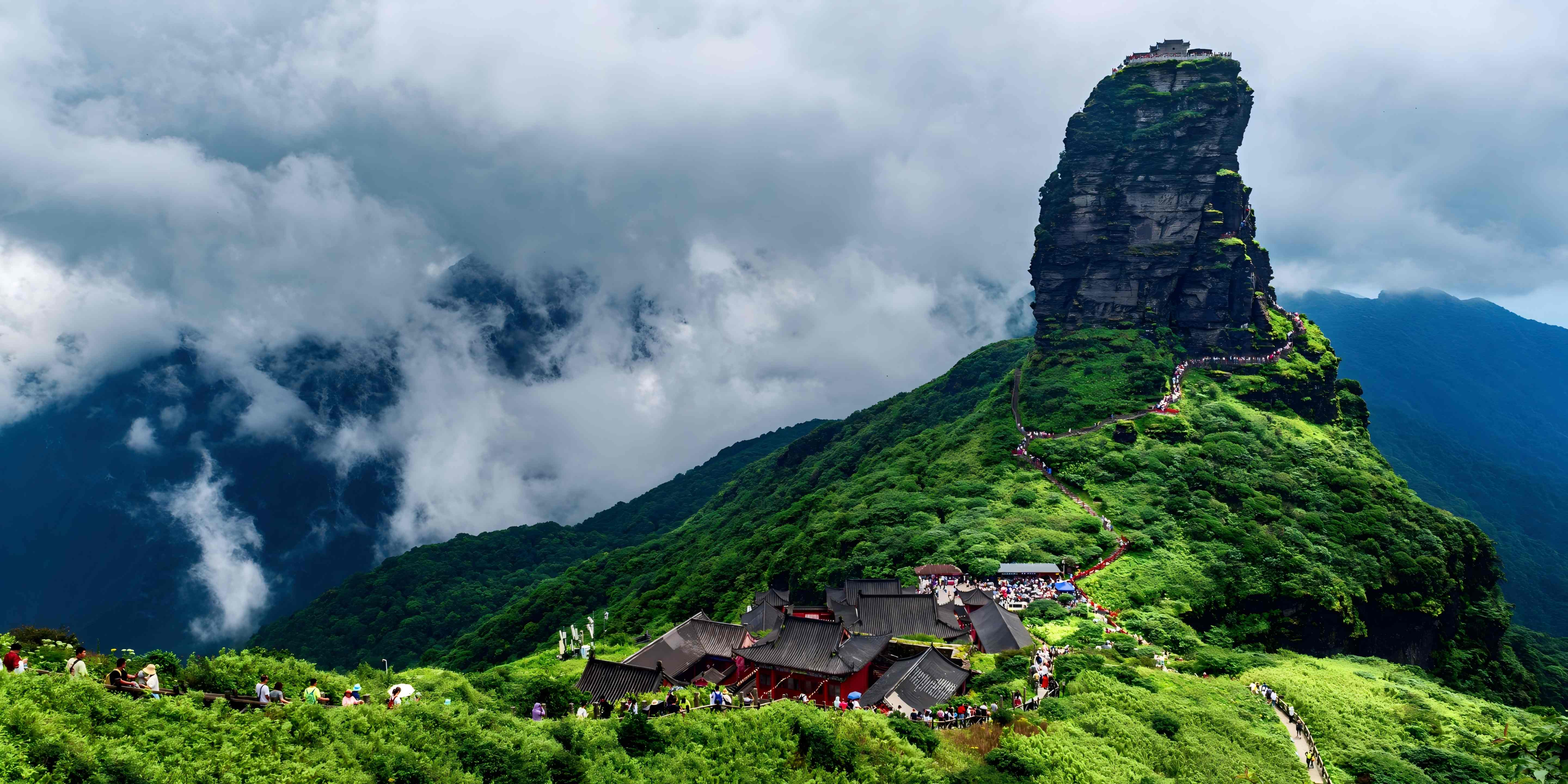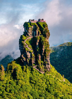 เป็นมรดกโลกทางธรรมชาติและแหล่งท่องเที่ยวระดับ 5A ของประเทศ ได้รับสมญานามว่า “นครแห่งท้องฟ้า” เป็นยอดเขาหลักของเทือกเขาอู่หลิง อีกทั้งยังเป็นธรรมสถานของพระเมตไตรยโพธิสัตว์ ยังได้รับการยกย่องร่วมกับเขาอู่ไถ่และเขาง้อไบ๊ว่าเป็นหนึ่งในห้าภูเขาศักดิ์สิทธิ์ทางพุทธศาสนาของจีน จักรพรรดิว่านลี่แห่งราชวงศ์หมิงเคยพระราชทานศิลาจารึกเป็นกรณีพิเศษ และสถาปนาที่แห่งนี้ให้เป็น “บรรพชนแห่งขุนเขาเลื่องชื่อในใต้หล้า” พลังสรรค์สร้างอันน่าพิศวงของธรรมชาติ และอารยธรรมพุทธศาสนาที่สืบทอดมานับพันปี ได้หลอมรวมกันอย่างกลมกลืน ณ สถานที่แห่งนี้ เมื่อคุณก้าวขึ้นสู่ยอดเขาทองเมฆาแดง เบื้องล่างคือทะเลเมฆที่โหมพลิ้ว สะพานลอยฟ้าที่เชื่อมวัดโบราณอายุกว่าร้อยปีทั้งสองฝั่งปรากฏเลือนรางท่ามกลางสายหมอก ณ ขณะนั้น ราวกับได้ยืนอยู่บนพรมแดนอัศจรรย์ระหว่างโลกมนุษย์กับแดนเซียน