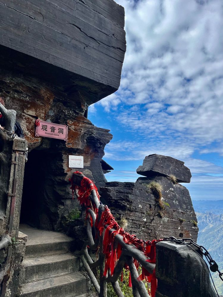 ถ้ำกวนอิมอาคารหินลอยฟ้าบนผาสูงชัน ประดิษฐานพระโพธิสัตว์กวนอิม ผู้ศรัทธาสามารถไปขอพรด้วยใจบริสุทธิ์ โยนก้อนหินเล็กๆ เข้าถ้ำ เชื่อกันว่าจะได้รับพรให้มีบุตร สถานที่แห่งนี้จึงนับเป็นหนึ่งในแดนศักดิ์สิทธิ์แห่งความรักของภูเขาศักดิ์สิทธิ์
