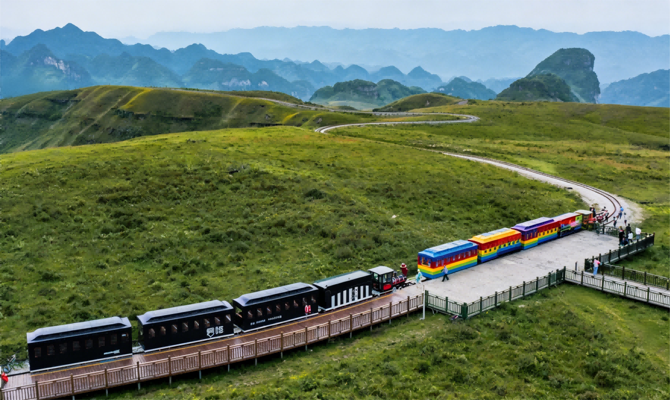 นั่งรถไฟเล็กชมวิวแบบสบายๆ ผ่านทุ่งหญ้า ใช้เวลาประมาณ 1.5 ชั่วโมง ระหว่างทางผ่านหลุมยุบกลางทุ่งหญ้า และป่าหมื่นยอดเขา เหมาะสำหรับการเที่ยวชมแบบผ่อนคลาย