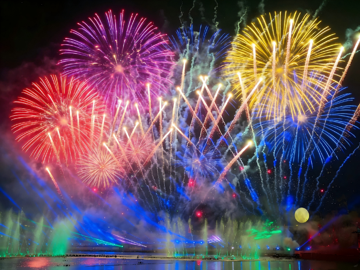 ยามค่ำคืนมักมีการแสดงที่ผสานดอกไม้ไฟ โดรน เลเซอร์ และม่านน้ำ พร้อมดนตรีประกอบ สร้างประสบการณ์ภาพและเสียงที่ตื่นตาตื่นใจ