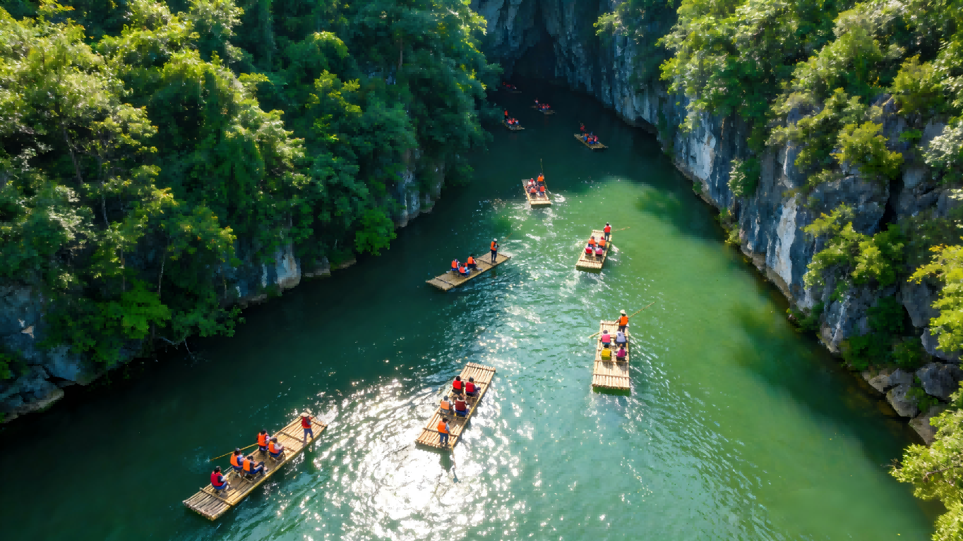 เทียนเหอถานตั้งอยู่ชานเมืองกุ้ยหยาง เป็นแหล่งท่องเที่ยวธรรมชาติที่รวมภูเขา สายน้ำ ถ้ำ แอ่งน้ำ และน้ำตกแบบคาสต์ไว้อย่างครบถ้วน ได้รับสมญาว่า “สุดยอดหนึ่งเดียวแห่งภาคกลางกุ้ยโจว” ประหนึ่งสวนถาดย่อส่วนของธรรมชาติ ภายในรัศมีเพียงไม่กี่กิโลเมตร ได้อัดแน่นแก่นแท้ของภูมิประเทศคาสต์แห่งกุ้ยโจว เปรียบเสมือนตำราธรณีวิทยาแบบสามมิติ การเที่ยวชมแบ่งออกเป็นสองส่วน คือ “ถ้ำน้ำ” และ “ถ้ำแห้ง” ล่องเรือเข้าสู่ถ้ำน้ำอันลึกล้ำ ชมเสาหินงอกหินย้อยหลากรูปทรง; เดินเท้าในถ้ำแห้ง “วังทางช้างเผือก” ราวกับหลงเข้าไปในเขาวงกตใต้พิภพ ไฮไลต์ที่น่าตื่นตาคือ “น้ำตกสะพานธรรมชาติ” บริเวณทางออกของอุทยาน ซึ่งมีความสูงต่างระดับหลายสิบเมตร สายน้ำพุ่งทะยานผ่านช่องสะพานธรรมชาติลงมาอย่างยิ่งใหญ่ตระการตา