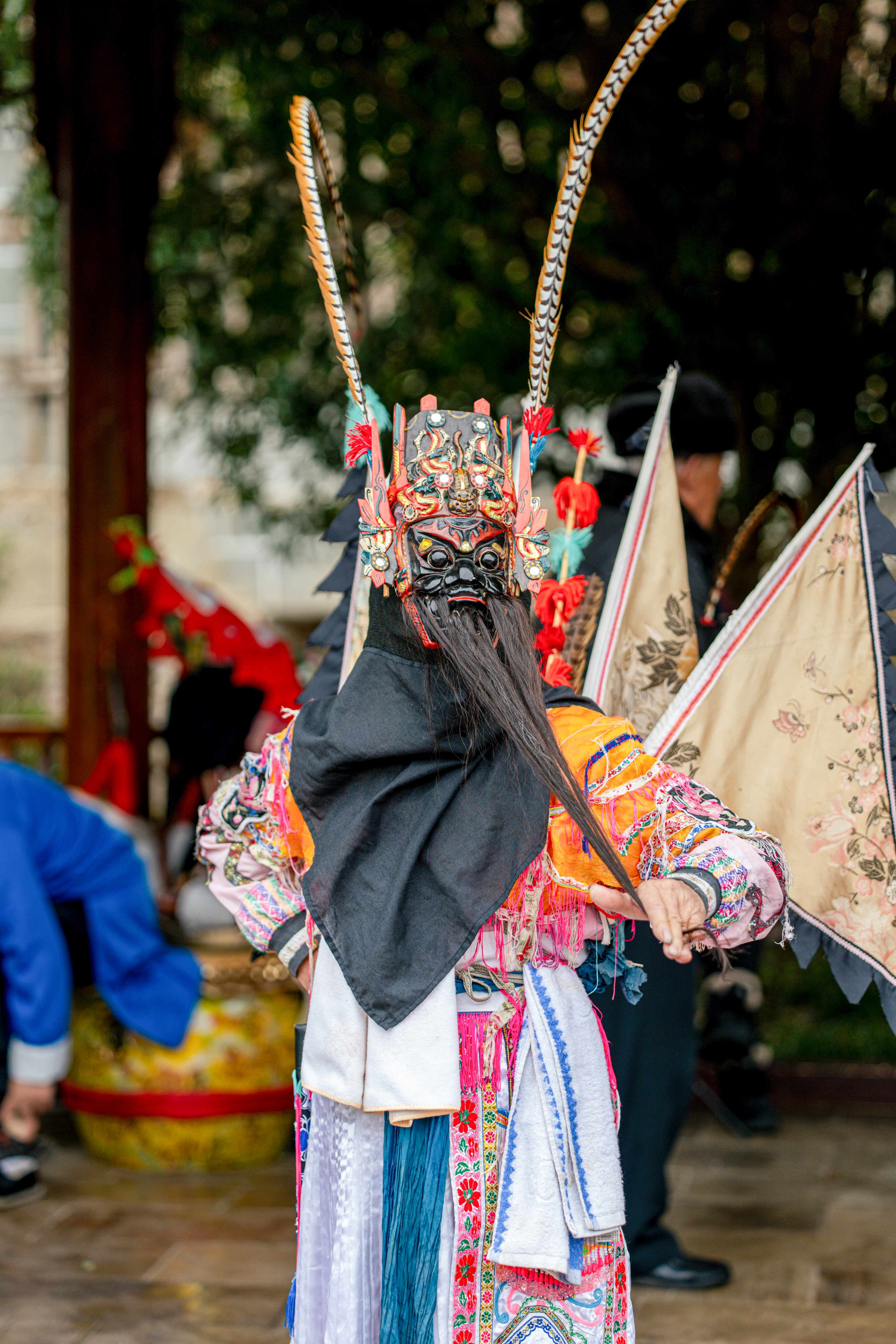 สัมผัสการแสดงงิ้วถุนเป่าสุดดุดันและทรงพลัง นักแสดงสวมหน้ากากไม้แกะสลักประณีต ถ่ายทอดเรื่องราวประวัติศาสตร์สามก๊กและตระกูลหยางด้วยพลังเสียงและลีลาที่น่าตื่นตา