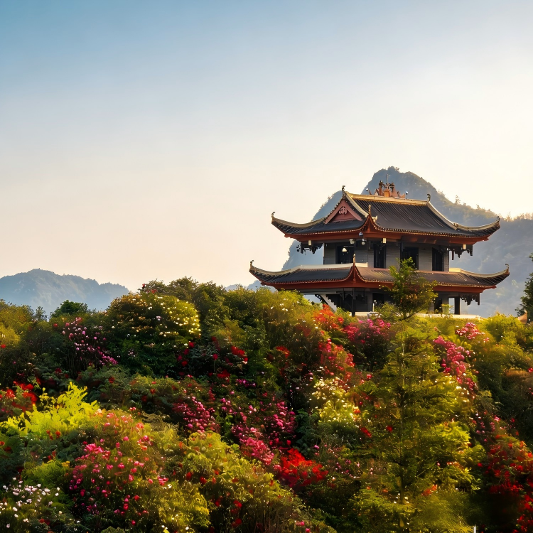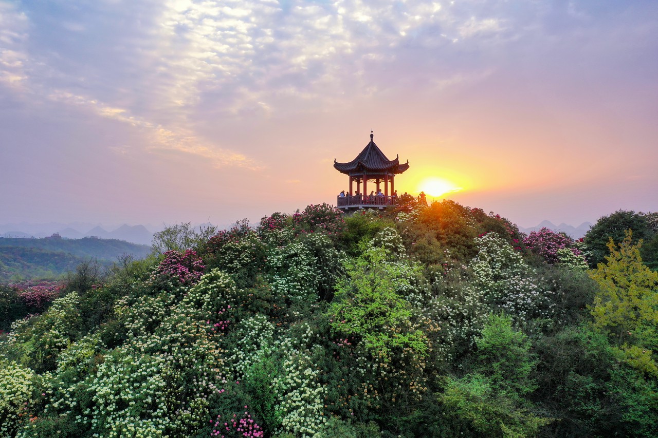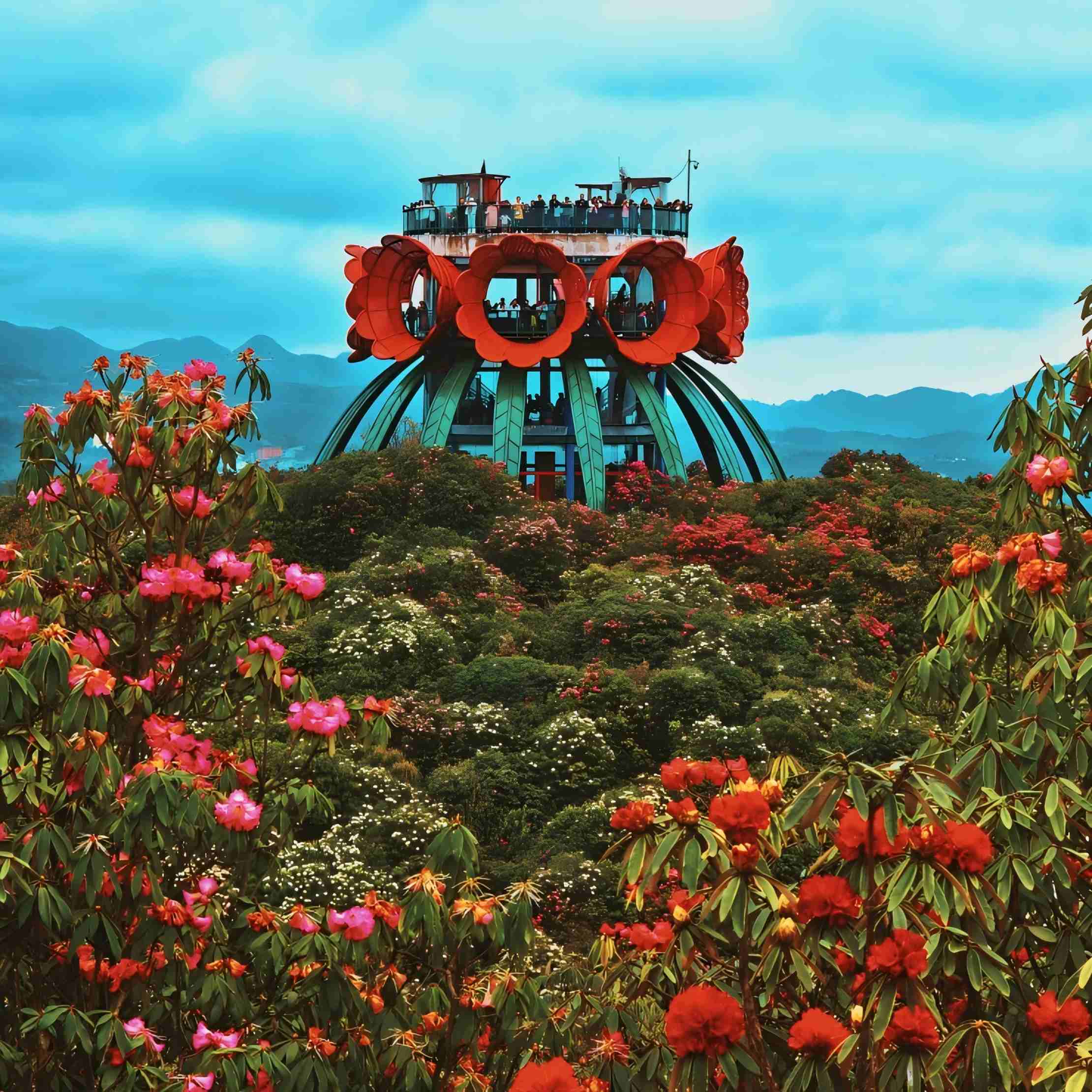 หอหมื่นบุปผาเมื่อก้าวขึ้นสู่หอไม้สามชั้น แล้วยืนมองออกไปสุดสายตา ดอกกุหลาบพันปีที่บานสะพรั่งทั่วทั้งขุนเขาจะคล้ายกับกำลังโบกมือทักทายคุณ เปรียบเสมือนพิธีสวนสนามอันยิ่งใหญ่ตระการตา