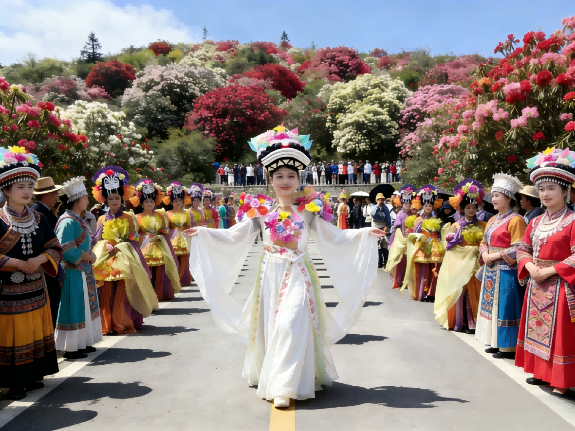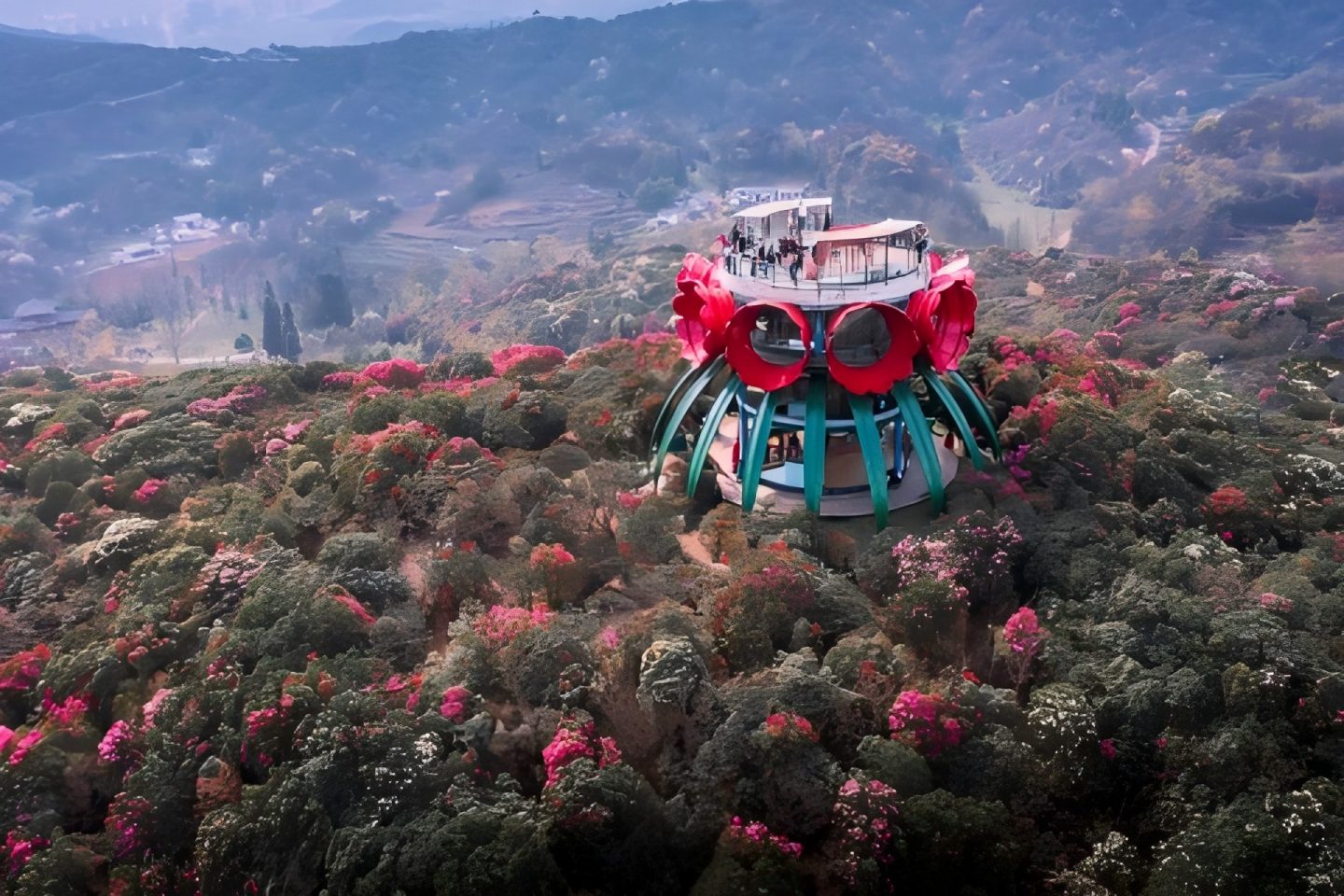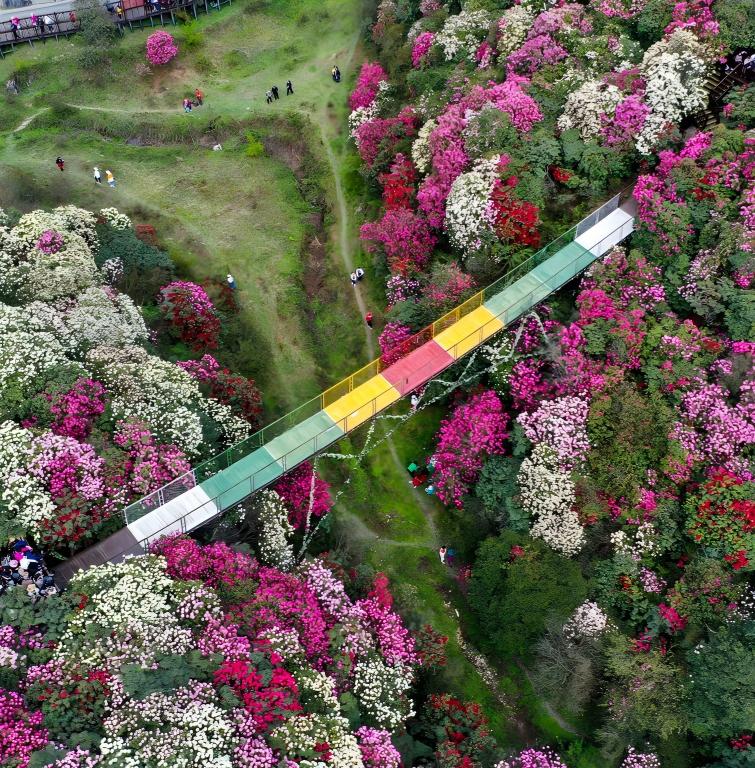"เดินไปตามสันเขา ทันใดนั้นก็เหมือนดิ่งลงสู่ทะเลแห่งดอกไม้หลากสีชมพู ขาว ม่วง และแดงเข้ม—ราวกับสายลมฤดูใบไม้ผลิได้พลิกจานสีของมันไว้ที่นี่ กระจายเป็นผืนกว้างสุดสายตาที่งดงามราวกับความโรแมนติกอันน่าทึ่งทอดยาวไปไกลสุดสายตา"