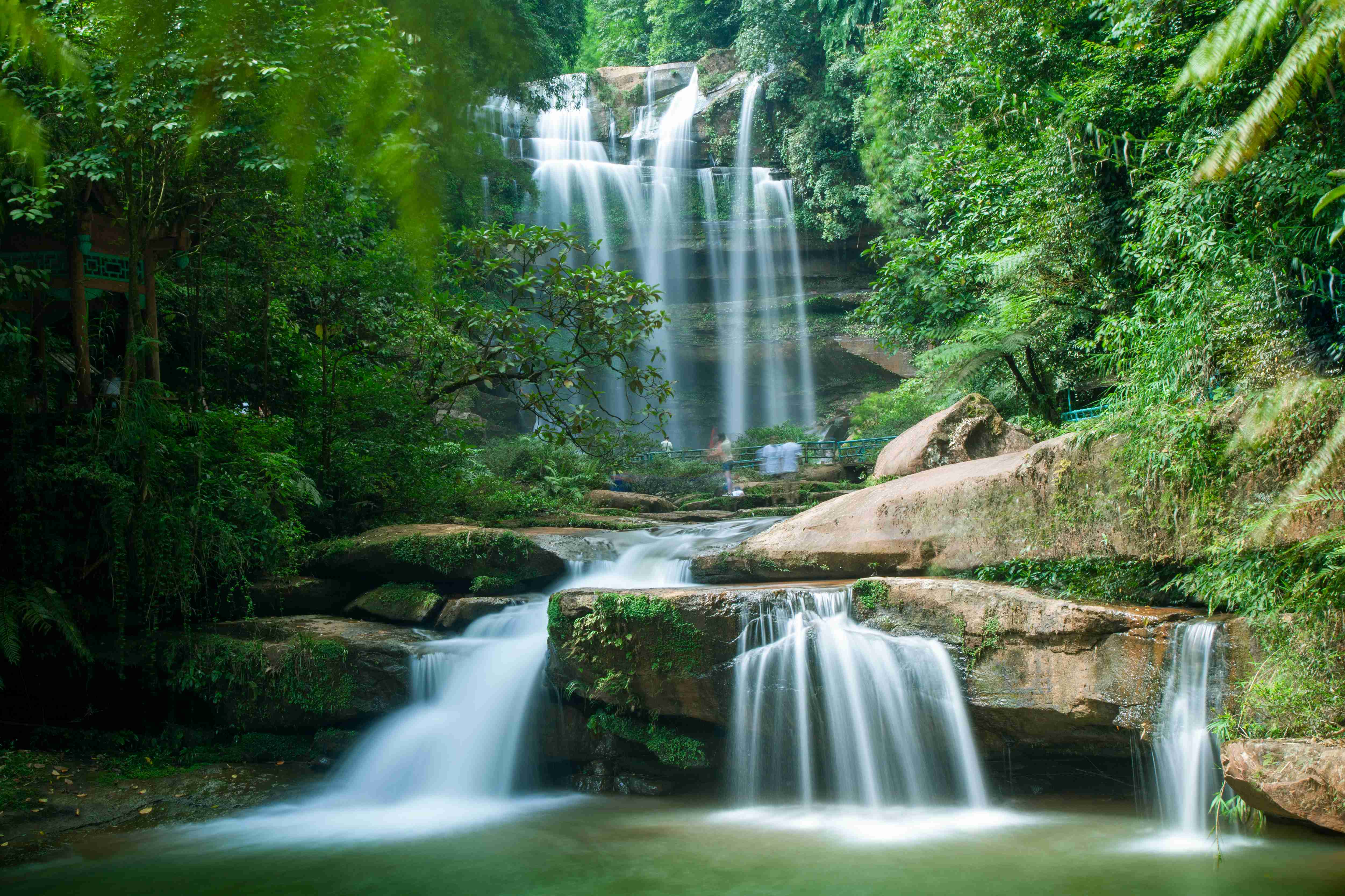หัวใจของสิหองอู่ซ่อนอยู่ภายในน้ำตกชั้นลดหลั่นสี่ชั้น น้ำตกแรกที่ชื่อว่า "ถ้ำม่านน้ำ" สูงตระหง่านถึง 31 เมตร นักท่องเที่ยวสามารถเดินตามทางเดินหินด้านหลังม่านน้ำตกเพื่อสัมผัสความเย็นสดชื่นจากละอองน้ำที่โปรยปราย ต่อเนื่องไปยัง "สระพระจันทร์" ซึ่งแผ่กว้างเป็นรูปโค้งคล้ายพระจันทร์เสี้ยวสีเงิน ขนาดกว้างถึง 42 เมตร น้ำตก "กบเหินหน้าผา" กว้าง 43 เมตร มีลักษณะคล้ายกบยักษ์กำลังย่อตัวลงอาบน้ำ ขั้นสุดท้ายคือ "สระมังกรขาว" ที่พุ่งลงสู่เบื้องล่างสูง 60 เมตร พร้อมเสียงคำรามกึกก้องและพลังอันยิ่งใหญ่ ท่ามกลางสายน้ำที่ไหลลงสู่เบื้องล่าง สถานที่แห่งนี้ยังเป็นขุมทรัพย์ทางระบบนิเวศที่ล้ำค่า มีชื่อเสียงในฐานะ "สวนไผ่หมื่นต้น" พื้นที่แห่งนี้มีไผ่เขียวหลากหลายสายพันธุ์มากกว่า 40 ชนิด จาก 8 สกุล ที่เติบโตอย่างอุดมสมบูรณ์ ที่น่าทึ่งยิ่งกว่านั้นคือ ต้นไซแคคัส "ฟอสซิลมีชีวิต" ซึ่งมีอายุย้อนไปถึงยุคไดโนเสาร์ เรียงรายอยู่ตามทางเดินที่ปูด้วยหินแดนเซีย พืชหายากเหล่านี้ พร้อมด้วยชั้นหินแดนเซียสีแดงเข้มและสะพานหินธรรมชาติลึกลับ ร่วมกันสร้างภาพทิวทัศน์ทางนิเวศวิทยาโบราณอันงดงาม