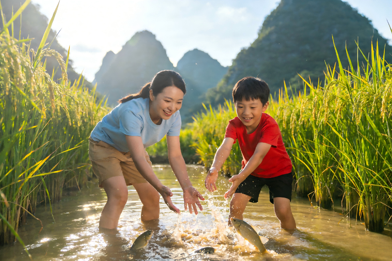 ขึ้นนั่งรถไฟเล็กกลางนาข้าว แล่นผ่านระหว่างป่ายอดเขาอันยิ่งใหญ่กับทุ่งรวงข้าวสีทอง ก้าวเข้าสู่ชุมชนน่าฮุยของชาวปู้อีที่เปรียบเสมือนอยู่ในโลกแห่งนิทาน พบพานความสนุกวัยเยาว์ในท้องทุ่งประหนึ่งท่องอยู่ในบทกวี -