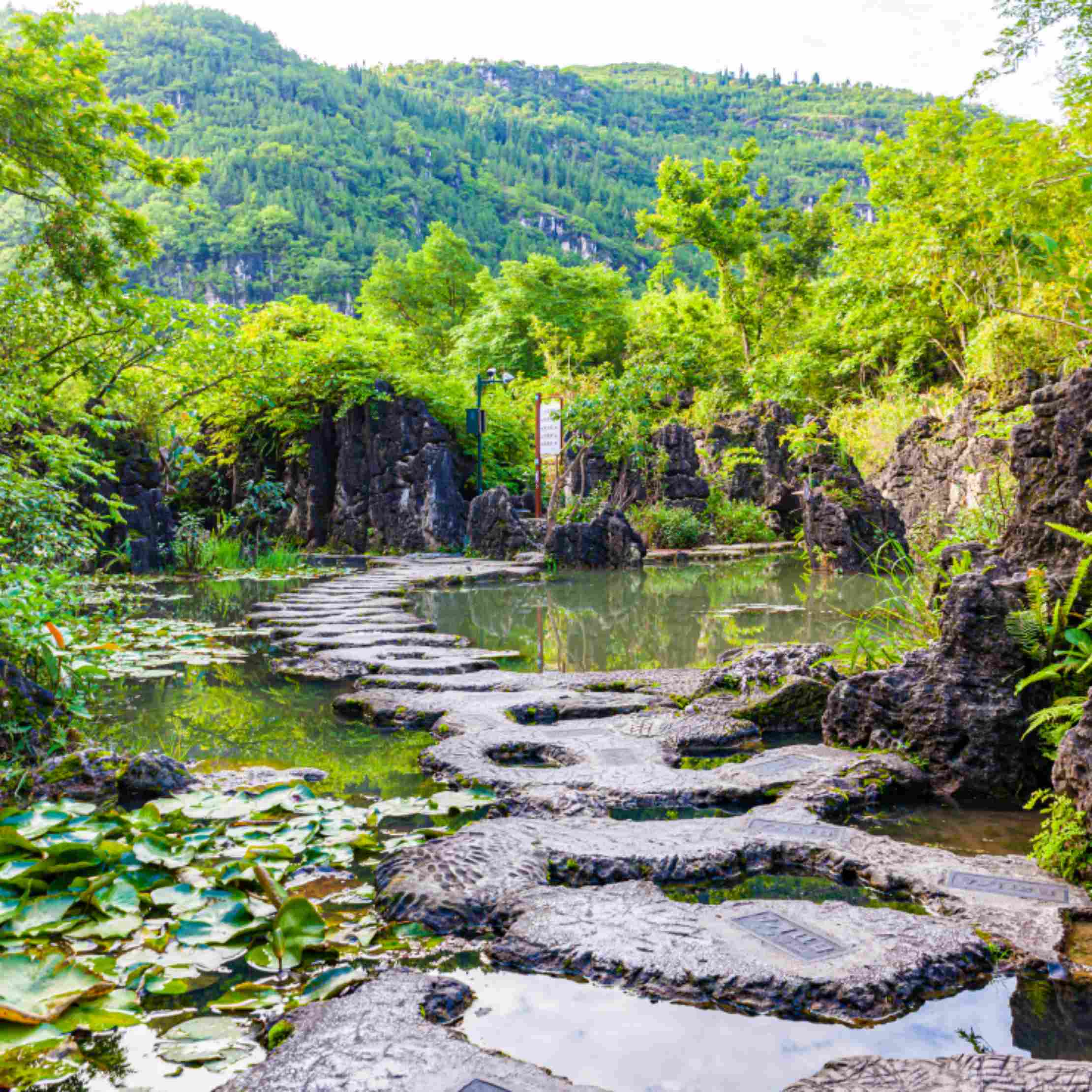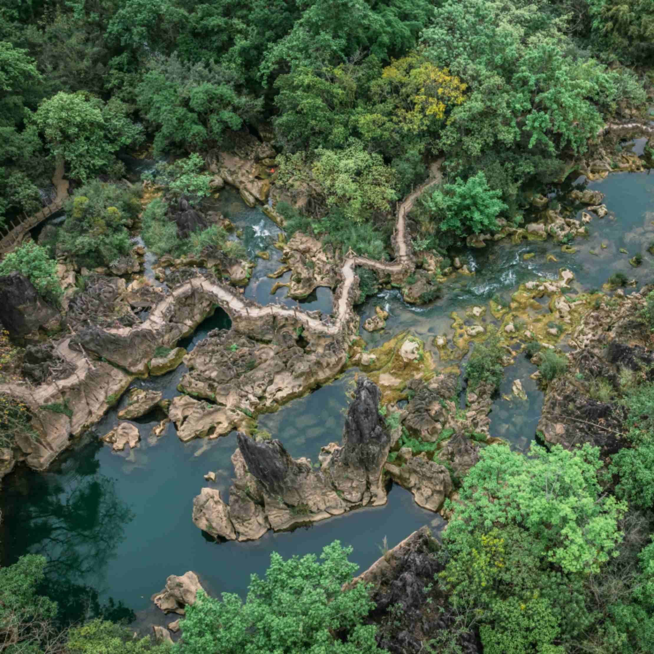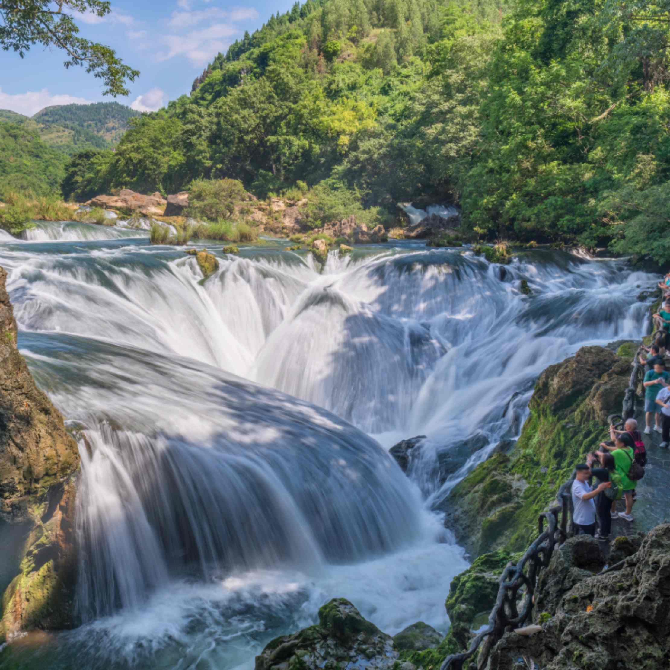 สะพานดาราสวรรค์ตั้งอยู่บริเวณปลายน้ำของเขตท่องเที่ยวน้ำตกหวงกั่วซู่ เป็นพื้นที่ที่ผสานภูเขา สายน้ำ โขดหิน ป่าไม้ ถ้ำ รากไม้ เถาวัลย์ และน้ำตกเข้าไว้ด้วยกันอย่างครบถ้วน รวมแก่นแท้ของภูมิประเทศแบบคาสต์แห่งมณฑลกุ้ยโจวไว้ในที่เดียว เป็นสวนธรรมชาติขนาดใหญ่