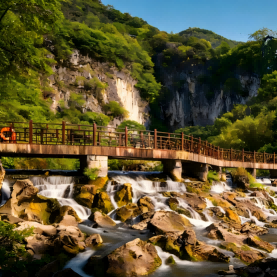 สะพานมังกรหมอบทางเดินยาวสีขาวที่พาดข้ามผิวน้ำ เมื่อมองจากระยะไกลดูคล้ายกับมังกรขาวที่คดเคี้ยวเคลื่อนไหว ใต้ร่างมังกรยักษ์ คลื่นน้ำสีขาวซัดสาด เบื้องหน้าไม่ไกลยังมีโขดหินรูปร่างประหลาดตั้งตระหง่านเสริมรับกันอย่างลงตัว งดงามตระการตา
