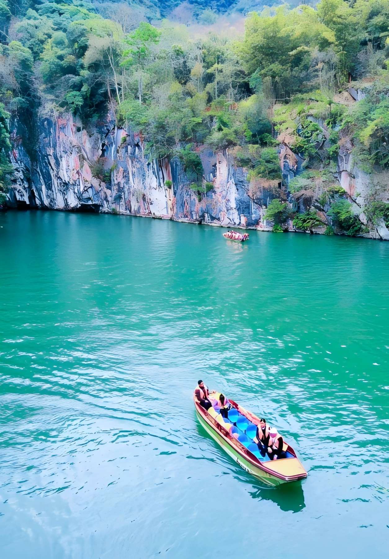 สระสวรรค์วังมังกรผืนน้ำในสระใสกระจ่างเขียวมรกต ดุจกระจกบานใหญ่ สะท้อนเงาขุนเขาและพฤกษาเขียวขจีโดยรอบ ล่องเรือลำน้อย ประหนึ่งพาผู้คนล่องเข้าสู่โลกแห่งความฝันอีกใบหนึ่ง