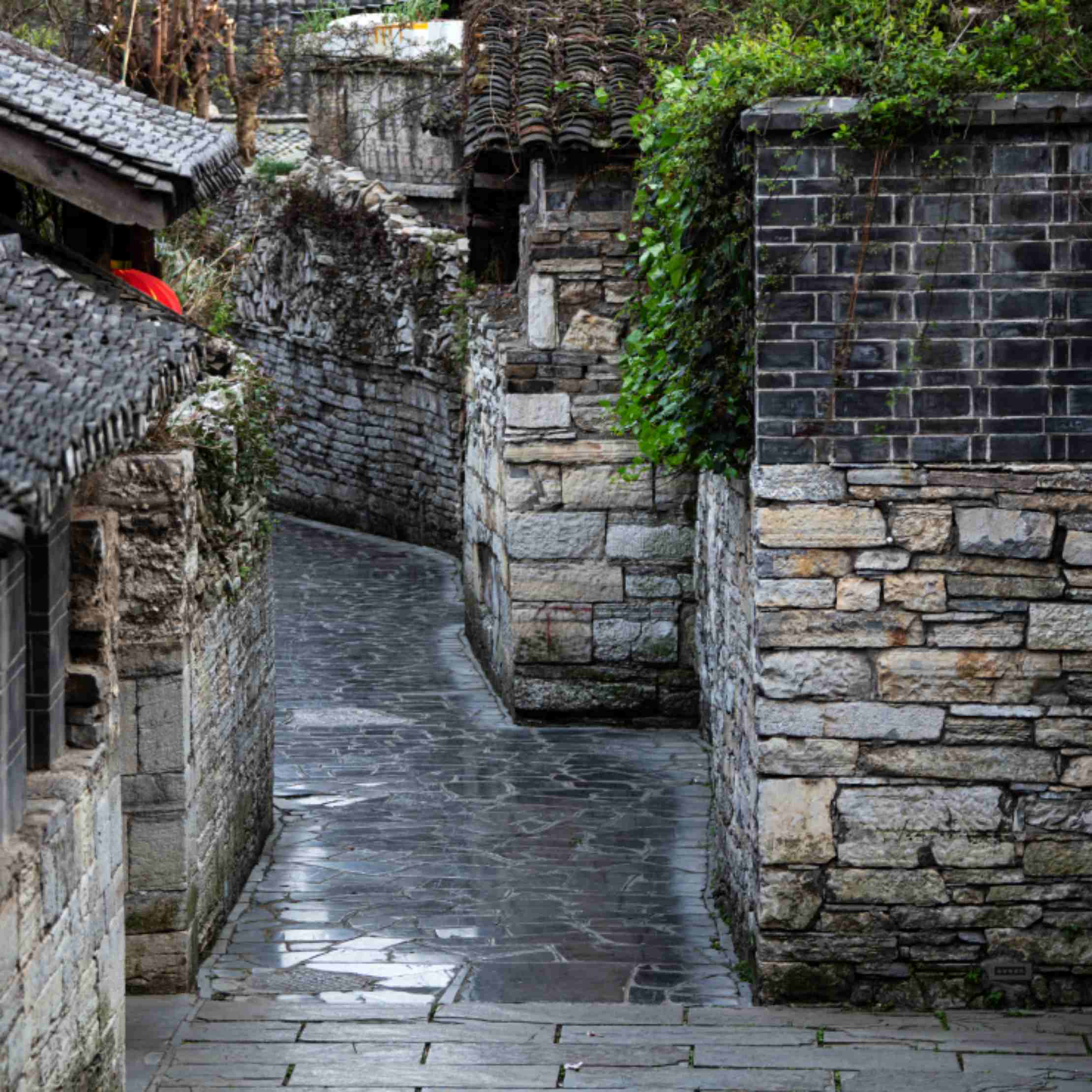 ถนนหลังสถานที่ถ่ายทำภาพยนตร์เรื่อง The Missing Gun ถนนหินครามปูเรียงคู่กับกำแพงหินก่อซ้อน มุมถ่ายภาพสวย ได้ภาพถูกใจ