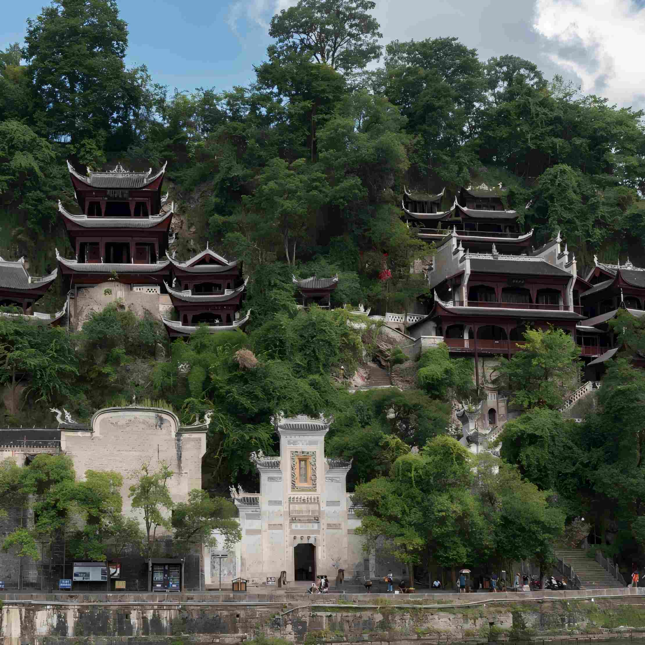 กลุ่มสถาปัตยกรรมโบราณถ้ำมังกรเขียวประกอบด้วย สะพานจู้เซิ่ง ถ้ำจงหยวน ถ้ำจื่อหยาง วังหมื่นปี ถ้ำมังกรเขียว และผาธูปหอม โดยเป็นหมู่อาคารที่หลอมรวมสถาปัตยกรรมของลัทธิขงจื๊อ เต๋า และพุทธ รวมถึงศาลาชุมชน สะพานและสถานีม้าโบราณไว้ในแห่งเดียวได้อย่างกลมกลืน