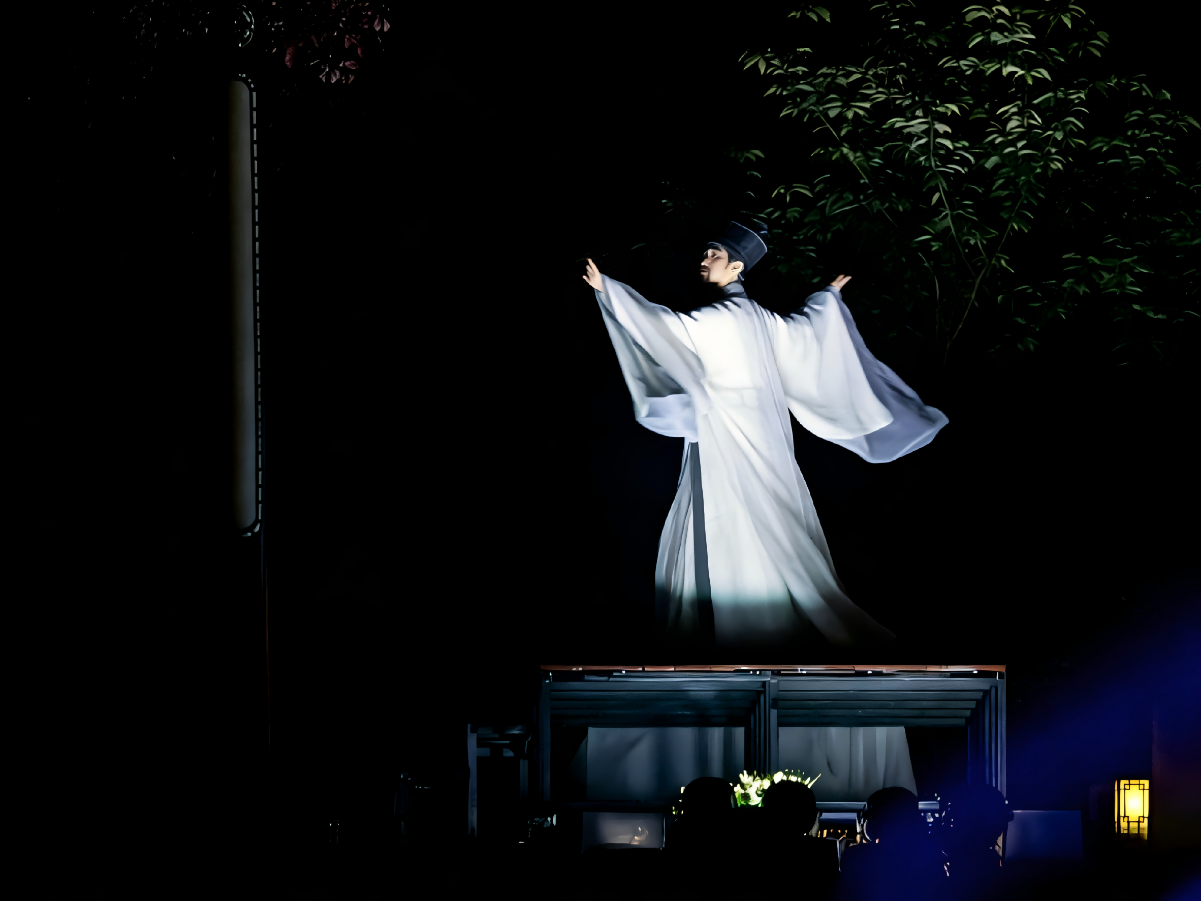 "การครุ่นคิดยามบ่ายที่ร้านน้ำชาติดริมแม่น้ำอู๋หยาง มองดูเงาสะท้อนของบ้านไม้หลังคาปูกระเบื้องที่แกว่งไกวอยู่บนผิวน้ำ ราวกับว่าทั้งเมืองโบราณกำลังล่องลอยไปตามกระแสน้ำ หายไปในความฝันอันยาวนานและยาวนาน"
