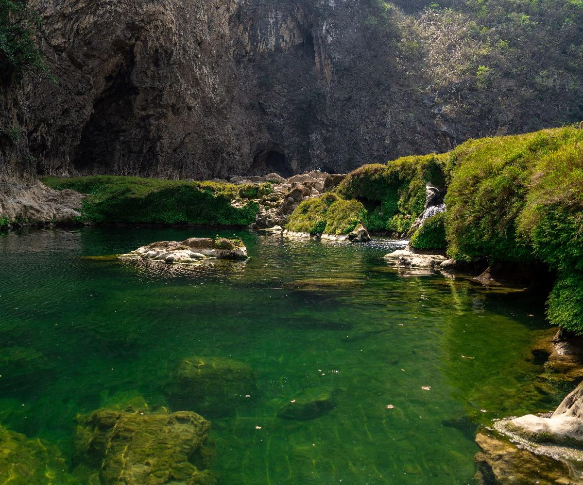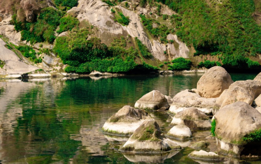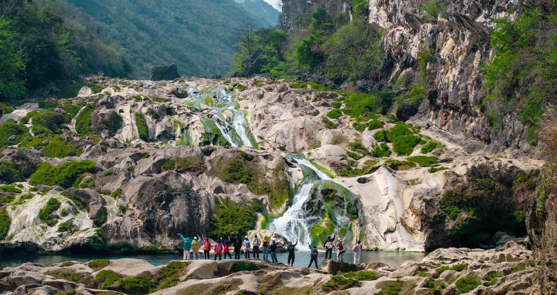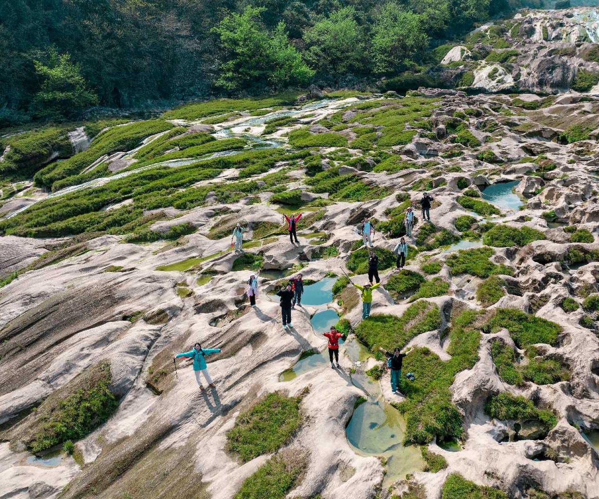 เมื่อคุณเดินเท้าไปตามเส้นทาง จะพบว่าแอ่งน้ำแข็งเหล่านี้มีรูปร่างหลากหลาย บ้างคล้ายหัวใจ ลูกน้ำเต้า ดอกเหมย หรือเมล็ดแตง แอ่งที่ใหญ่ที่สุดมีเส้นผ่านศูนย์กลางถึง 15 เมตร ลึกราว 10 เมตร ส่วนที่เล็กที่สุดมีขนาดเพียงเท่าเม็ดกระดุม แอ่งเหล่านี้ฝังตัวอยู่บนลำน้ำหินสีเทาขาว สะท้อนกับสายน้ำใสสะอาด งดงามราวกับ สร้อยไข่มุกใสระยิบระยับ ที่ธรรมชาติรังสรรค์ขึ้นเอง